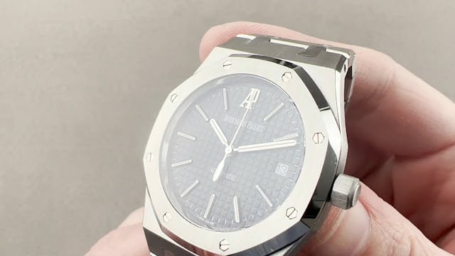The Audemars Piguet Royal Oak 15300ST.OO.1220ST.03 is encased in 39 mm of stainless steel surrounding a black Grande Tapisserie dial on a stainless steel bracelet. Features of this Audemars Piguet Royal Oak include hours, minutes, seconds, and date. This Audemars Piguet watch also measures 9.4 mm...
