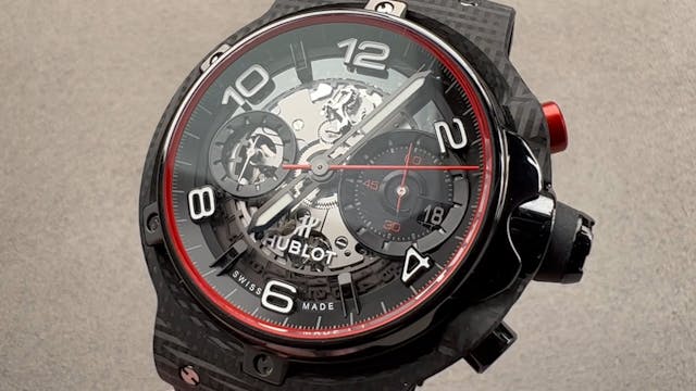 The Hublot Ferrari GT Unico 3D Limited Edition 526.QB.0124.VR is encased in 45mm of carbon fiber surrounding a skeleton dial on a black leather and rubber strap. Features of this Hublot Ferrari GT Unico 3D Limited Edition include hours, minutes, small seconds, date, and chronograph. ... -