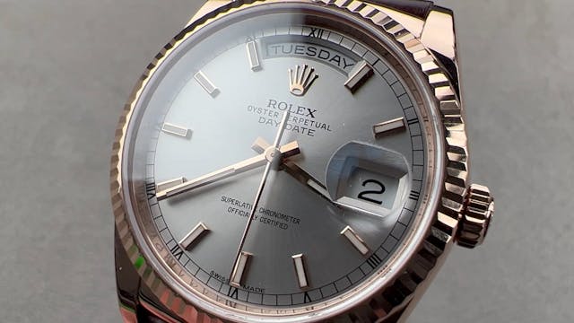 The Rolex Day-Date 118135 is encased in 36mm of 18k Everose gold surrounding a dark silver dial on a brown alligator strap. Features of this Rolex Day-Date include hours, minutes, seconds, day and date. This Rolex watch also measures 12.4mm in thickness and 43.2mm from lug-to-lug.