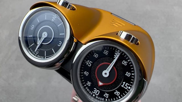 The Azimuth Twin Turbo is encased in 50.4mm of stainless steel and anodized aluminum surrounding two black dials on a black leather strap. Features of this Azimuth Twin Turbo include hours and minutes twice over. This Azimuth watch also measures 27mm in thickness and 46.5mm from lug-to-lug.