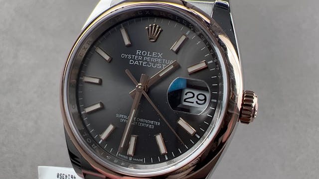 The Rolex Datejust 36 126201 is encased in 36mm of stainless steel and 18k Everose gold surrounding a slate sunburst dial on a stainless steel and 18k Everose gold Jubilee bracelet. Features of thi...