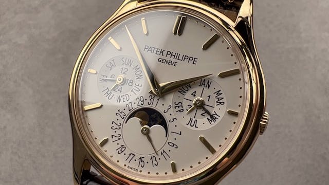 The Patek Philippe Grand Complications Perpetual Calendar 5140J-001 is encased in 37.2mm of 18k yellow gold surrounding a cream dial on a black alligator strap. Features of this Patek Philippe Grand Complications Perpetual Calendar include hours, minutes, day, date, 24-hour indicator, leap year, ...