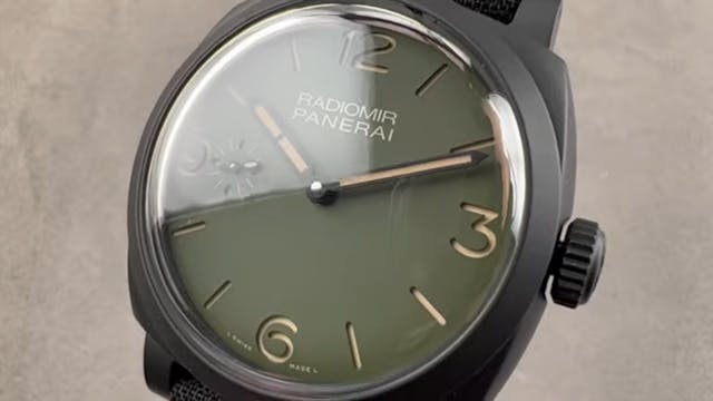 The Panerai Radiomir PAM 997 is encased in 48mm of black ceramic surrounding a green dial on a green canvas strap. Features of this Panerai Radiomir include hours, minutes, and small seconds. Thi... -