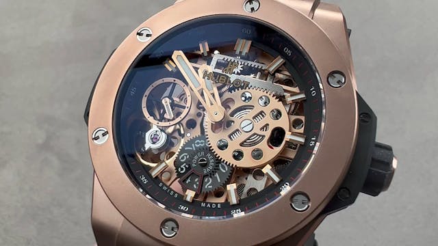 Hublot Big Bang Meca-10 King Gold 414.OI.1123.RX is encased in 45mm of 18k rose gold surrounding a skeleton dial on a black-lined structured strap. Features of this Hublot Big Bang Meca-10 King Gold include hours, minutes, small seconds, and power reserve indicator. This Hublot watch... -