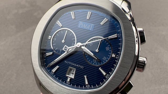 The Piaget Polo S Chronograph G0A41006 is encased in 42mm of stainless steel surrounding a blue dial on a stainless steel bracelet. Features of this Piaget Polo S Chronograph include hours, minutes, small seconds, date, and chronograph. This Piaget watch also measures 11.2mm in thickness and 46.7...