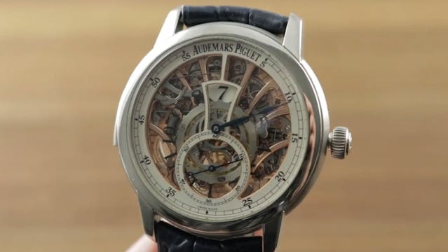 The Audemars Piguet Jules Audemars Openworked Jump Hour Minute Repeater with Jumping Hours and Small Seconds (26356PT.OO.D028CR.01) features a 43mm platinum case surrounding a skeletonized dial on a blue alligator strap with a platinum deployant buckle. Functions of this Jules Audemars Jump Hour ...