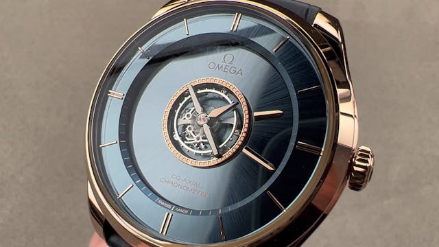 The Omega De Ville Tourbillon 528.53.44.21.03.001 is encased in 44mm of 18k Sedna red gold surrounding a blue dial on a blue alligator strap. Features of this Omega De Ville Tourbillon include hours, minutes, and central tourbillon. This Omega watch also measures mm in thickness and 15.1mm from 4...