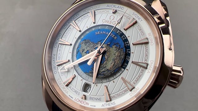 The Omega Seamaster Aqua Terra 150M GMT Worldtimer 220.53.43.22.02.001 is encased in 43mm of 18k Sedna red gold surrounding a siver dial with a laser-ablated grade 5 titanium representation of earth on a blue alligator strap. Features of this Omega Seamaster Aqua Terra 150M GMT Worldtimer include...