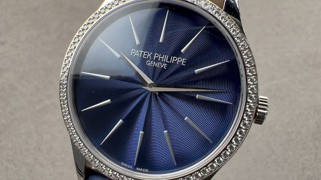 The Patek Philippe Calatrava 4897G-001 is encased in 33mm of diamond set 18k white gold surrounding a blue guilloché dial on a leather backed blue satin strap. Features of this Patek Philippe Calatrava include hours and minutes. This Patek Philippe watch also measures 6.7mm in thickn...